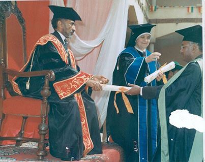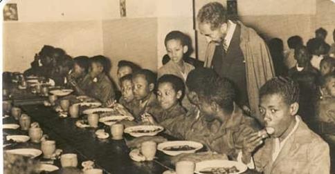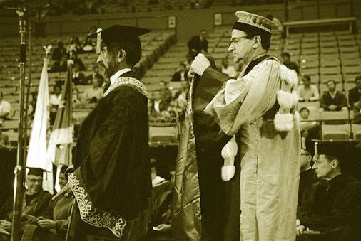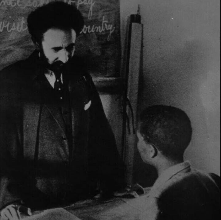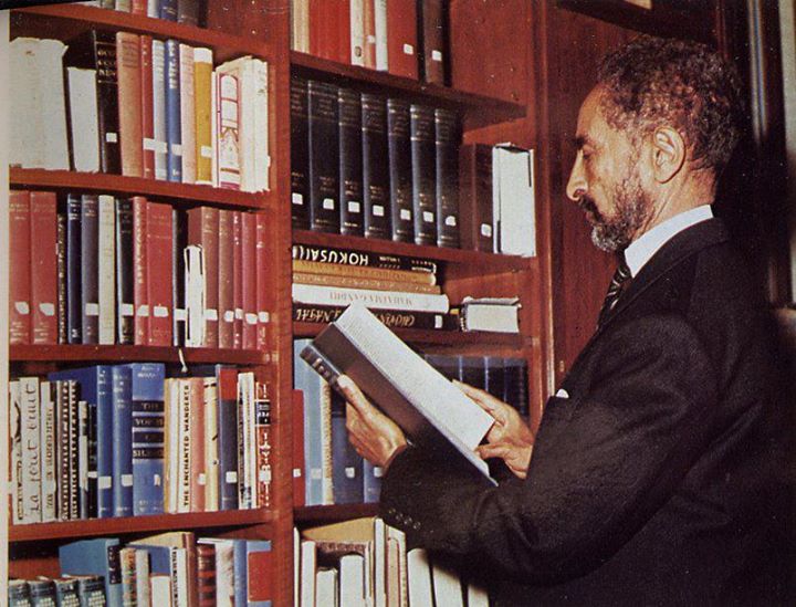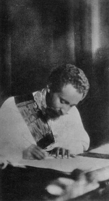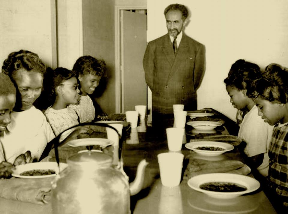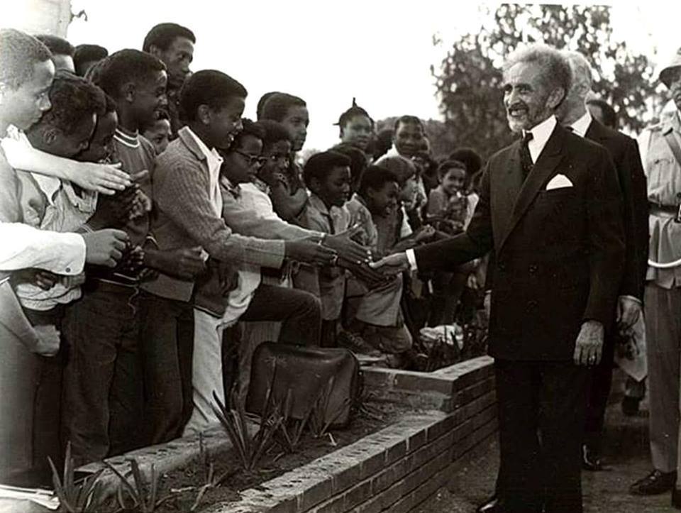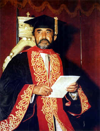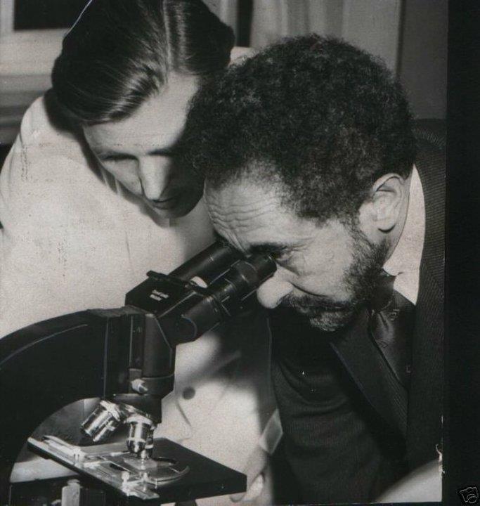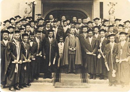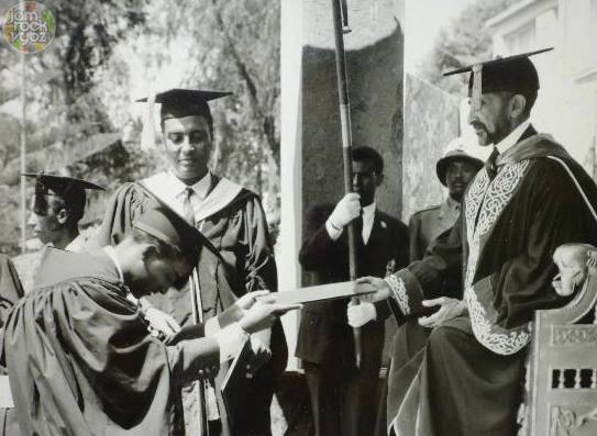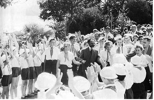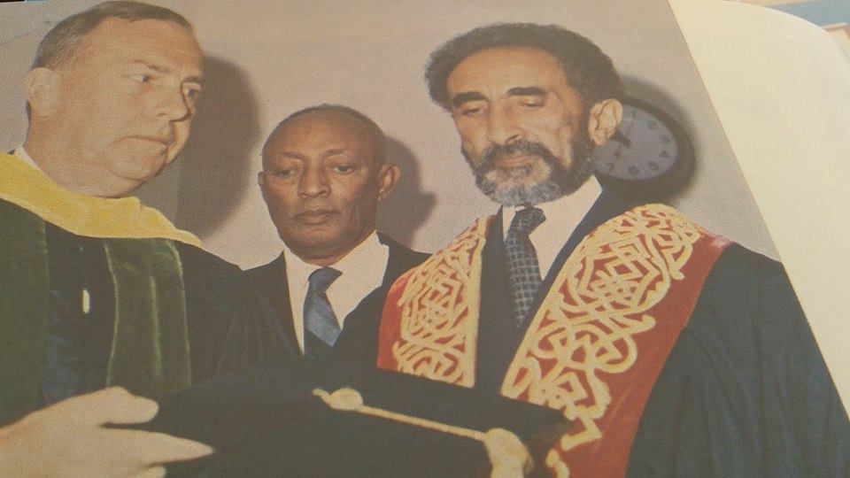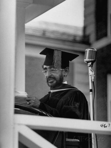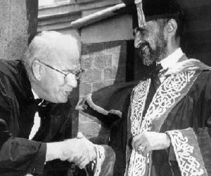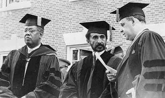 | President Mordecai W. Johnson escorts His Imperial Majesty Haile Selassie, Emperor of Ethiopia, to a special convocation during which the Emperor receives the honorary degree of Doctor of Laws, May 28, 1954. University Archives, Moorland-Spingarn Research Center, Howard University |