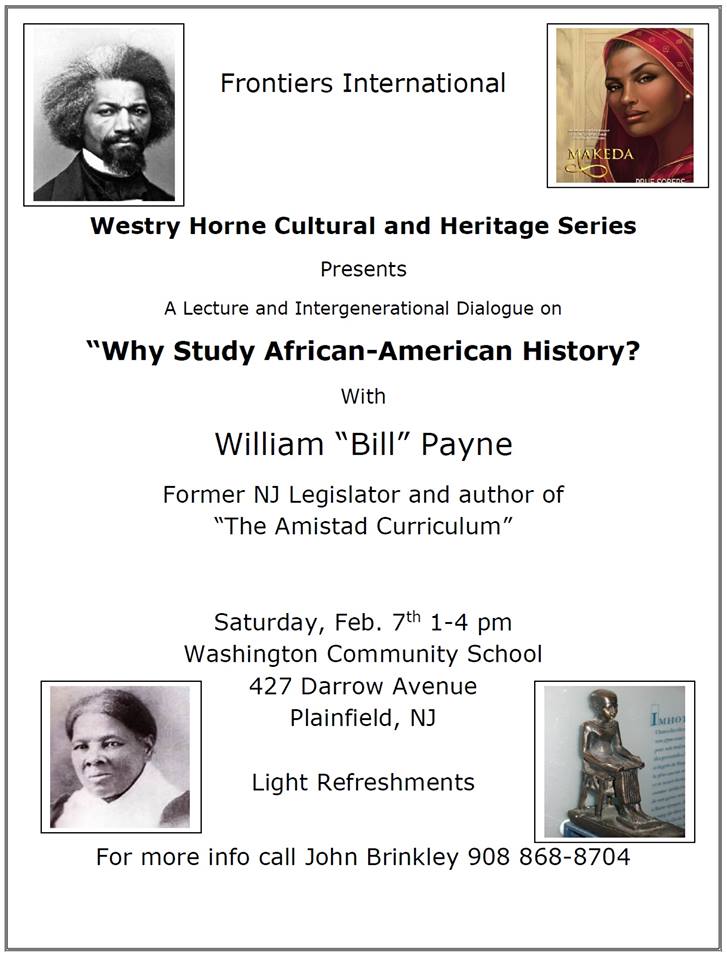 Plainfield Club Frontiers International presents Why Study African-American History? William 'Bill' Payne - Author of AMISTAD Curriculum Dr. Akil Kalaphne - Director of African-American Institute at Essex College FREE!! Light Refreshments!