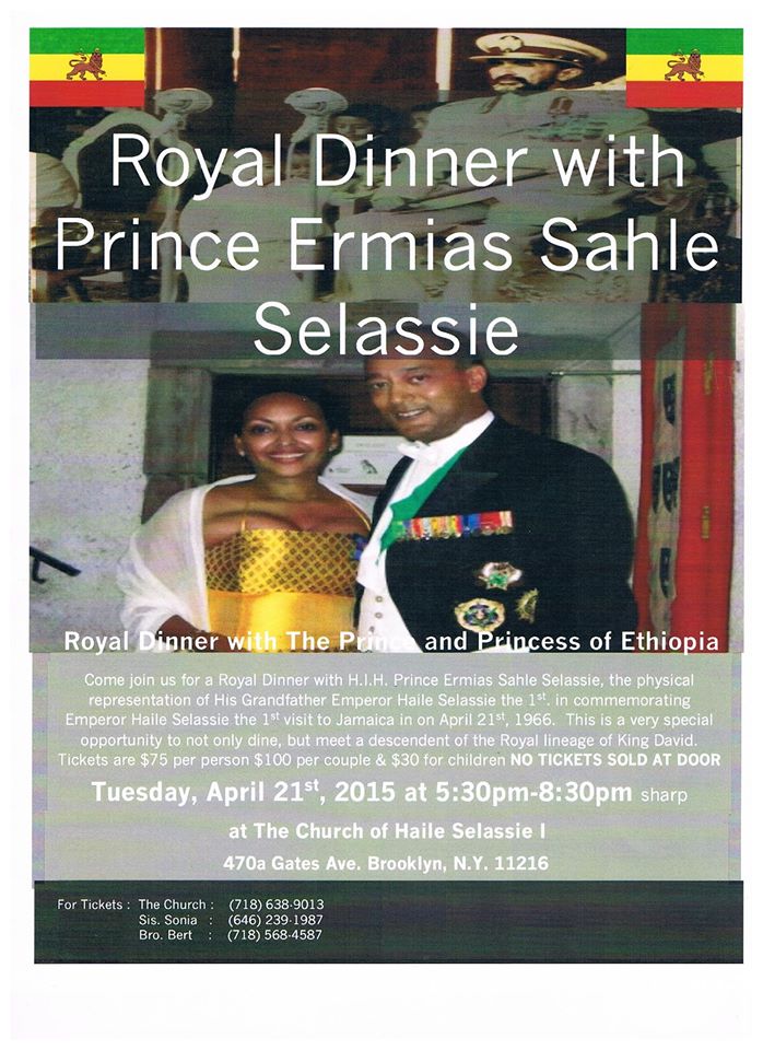 Come join us for a Royal Dinner with H.I.H. Prince Ermias Sahle Selassie, the physical representation of His Grandfather Emperor Haile Selassie I, commemorating Emperor Haile Selassie I visit to Jamaica on April 21, 1966. This is a very special opportunity to not only dine, but meet a descendant of the Royal lineage of King David.
