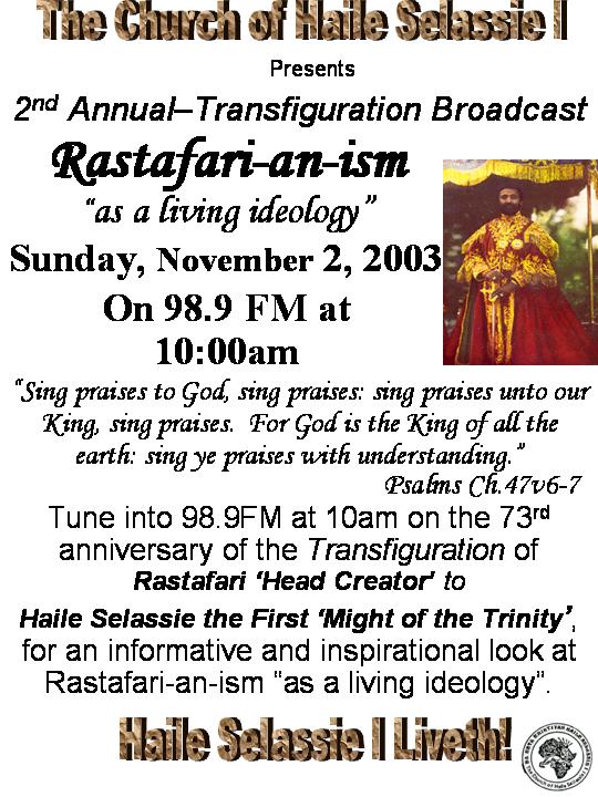 This day is celebrated quietly with a short Prayer Service starting 11am. Then celebrate with Rasta music, rice and peas, vegetables, fish, and closing with a short Prayer of thanksgiving and blessing by the Priest in-charge.