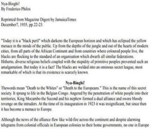"Excerpt from the propaganda article 'The Secret Society of the Blacks / Nha-Binghi - Destruction of the Whites'. Written by the NAZI Fredrico Philos (to create an alliance between the 'Africans' and the 'Communists'), published in the Austrian Newspaper 'Neues Wiener Tageblait', on 17th August 1935: Haile Selassie - Head of the Secret Society As mentioned above, Russia was the only state, which was friendly towards the Pan-African Congress. The negro delegates were very warmly welcomed and treated by the Russian government courteously. They were invited to banquets, and great gratitude was shown in every aspect. In any case, it is strange, and it does not lack a certain ambition that Russia has made the congress possible, which could have serious consequences for Europe. The Negus Haile Selassie was unanimously declared at the congress as an absolute ruler of the Nha-Binghi. He took the functions and vowed to free the negroes of the world. He swore the war against the Europeans, as he expressed himself (1930) 'Death to the oppressor of the black race'."
