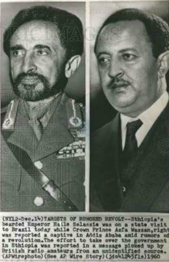 (London, Dec 14, 1960)Crown Prince Asfa Wassan, eldest son of Emperor Haile Selassie of Ethiopia, has taken over leadership of the African nation in a swift coup to end “3000 years of injustice,”Radio Addis Ababa reported yesterday[Dec, 13].The 44-year-old crown prince said, the government was in the full control of himself backed by the army and police.Emperor Selassie, the “Conquering Lion of Judah,” traces his ancestry to King Solomon and the Queen of Sheba.In Sao Paulo, Brazil, where the emperor is visiting, the tiny monarch said he had reports from the Ethiopian capital that “the situation is normal. ::::::::::::::::::::::::::::::::::::: (Washington, Dec 24)The coup in Ethiopia last Thursday which reportedly ousted Emperor Haile Selassie and turned the reins of government over to his son, Crown-Prince Asfa-Wossen, appeared this week to have ended in failure with the return of the Emperor from Brazil later in the week, where he was on a state-visit when the coup was reported. Although the news from the nation’s capitol city of Addis Ababa was still sketchy this week, this much appeared true. Upon the return of his father the Crown-Prince renounced the coup, charging his action was forced, and swore continuing loyalty to the Emperor. There were reports following the coup that in inhuman massacre had broken out and that there were bloody battles in the streets of the nation’s capitol city. The return of the Emperor was reportedly greeted by throngs of thousands of his subjects who proclaimed anew their loyalty everywhere he appeared. At the beginning: of this week this much was certain. The coup had failed,and Haile Selassie, “King of Kings”, “The Lion of Judah”, direct descendant of King Solomon was still Emperor and ruler of Ethiopia.