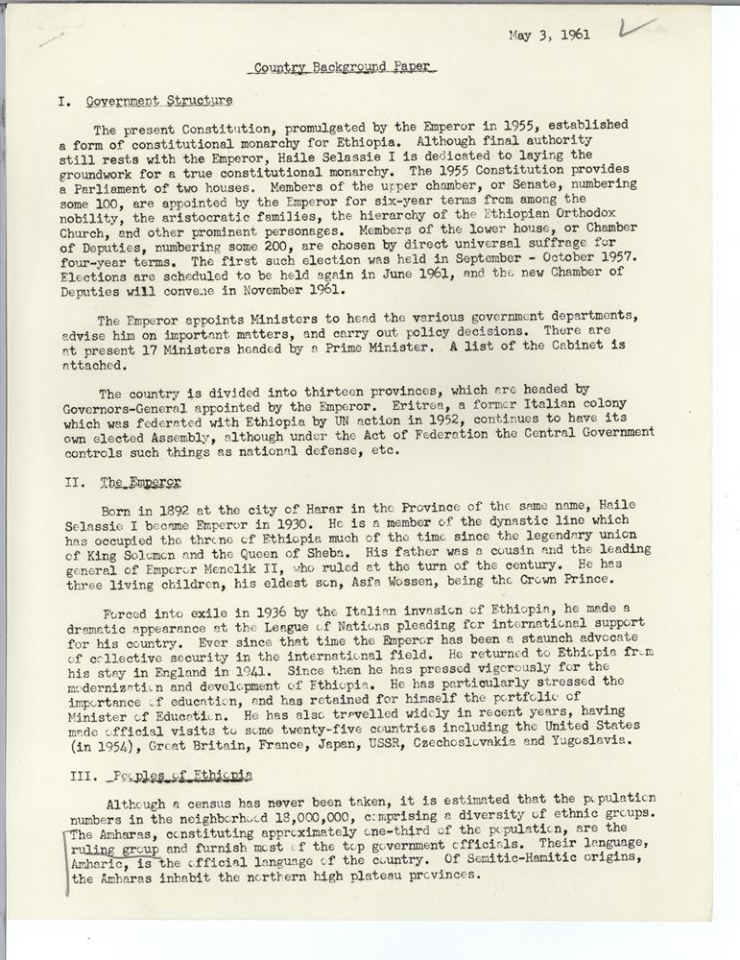 Intelligence provided to JFK regarding the government of Ethiopia.