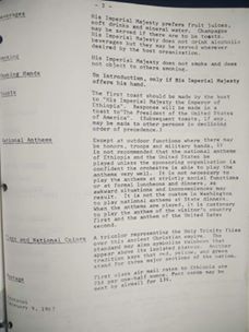 "Due to religious laws pork, shellfish and web-foot fowls should not be served." Also, "His Imperial Majesty does not drink alcoholic beverages." Source: Emperor Haile Selassie's State Visit to the United States of America (July 7-12, 1969)