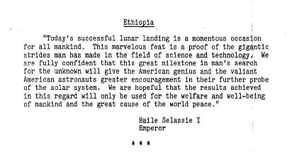 We thank you for the gracious message of good wishes which you bring on this occasion from the Emperor and the people of Ethiopia and for the kind words which you have spoken in our regard.