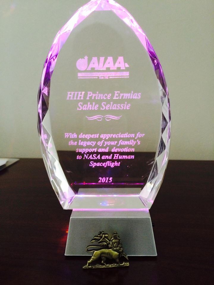 The American Institute of Aeronautics and Astronautics (AIAA) has awarded His Imperial Majesty Haile Sellasie,and His grandson HIH Prince Ermias Sahle Sellasie Haile Sellasie for their family's support and devotion to NASA since 1962. The event took place at The Johnson Space Station on 12/3/2015. Astronauts, Space Scientist, Future Scientists, NBA Players,Entertainers attended the event. Mr.George Abby, the former director of Johnson Space Station,Representative of the Royal House of Portugal Ulisses Pauleta Rolim, and the Ethiopian Royal Family were at hand.