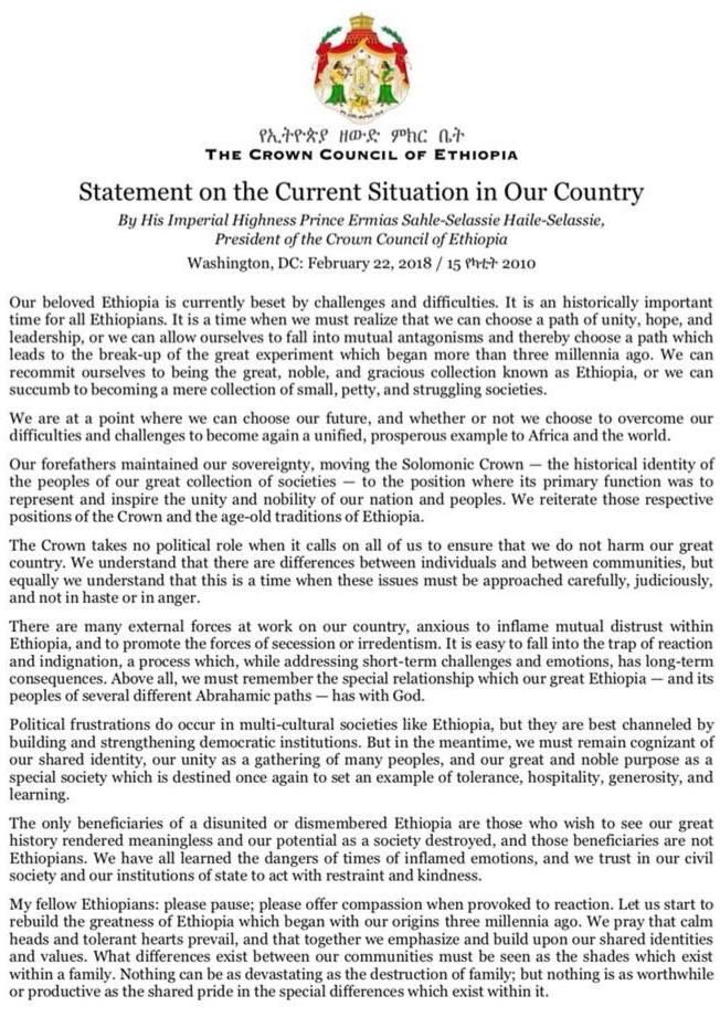 A Statement from the Crown Council of Ethiopia by its President, His Imperial Highness Prince Ermias Sahle-Selassie Haile-Selassie