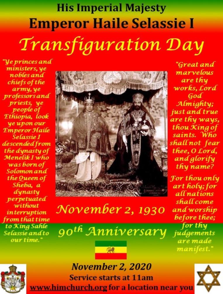 Greetings Rastafarian People, Brethren and Sistren, and those who Love Justice and hate aggression, The Church of Haile Selassie I will be holding its annual service in recognition of the 90th anniversary when Negus Tafari Makonnen ascended the royal throne of King David and King Solomon as His Imperial Majesty Emperor Haile Selassie I and elevated as the Might and the 1st Power of the Trinity. For Rastafarians this is the moment in time of Transfiguration, when God began walking amongst man and woman on earth.