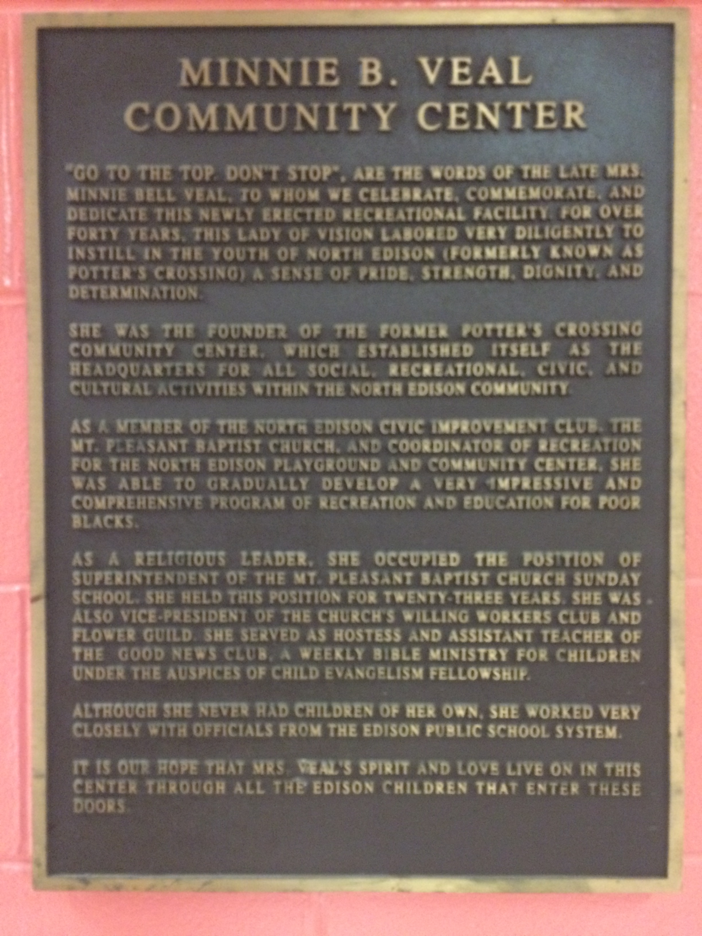 "Go To The Top. Don't Stop", are the words of the late Mrs. Minnie Bell Veal, to whom we celebrate, commemorate, and dedicate this newly erected recreational facility. For over forty years, this lady of vision labored very diligently to instill in the youth of North Edison (formerly known as Potter's Crossing) a sense of pride, strength, dignity, and determination.