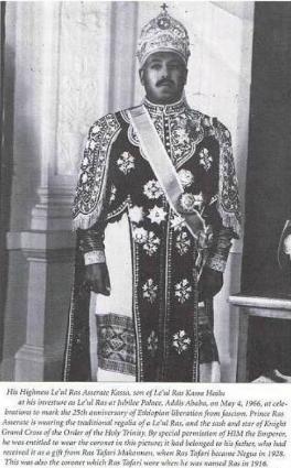 Formerly the only distinctive mark of honor for princes had been their golden headgear. But now We arranged that the golden headgear should be for Rases who had been appointed by virtue of hard work and services, while for the Crown Prince and for princes of royal descent We had made a pearl-studded head-gear (coronet), smaller than a crown but excelling the golden headgear in size and in beauty of workmanship; for the ladies of Our family and the wives of princes golden diadems, smaller than those for princes, and corresponding to their rank. My Life and Ethiopia's Progress, Volume One: 1892-1937
