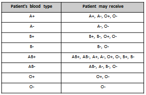 In the event it is needed and professional health care support is not available, then the chart to the right provides a reference of what blood types can be received by a patient in need of blood.